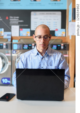 Man sitting on beanbag indoors working on laptop in office with large windows. Modern interior design with wooden flooring and bookcases. Daylight illuminating the comfortable environment.