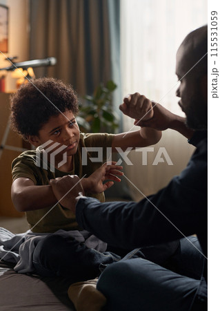 Vertical portrait of young teenage boy fighting with father aggressively in home bedroom with dramatic light