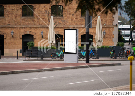Blank vertical digital billboard mockup standing on city street near bicycles