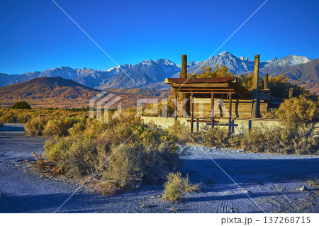 Abandoned Wooden Building in Owens Valley with Snow Capped Mountains and Wild Sagebrush