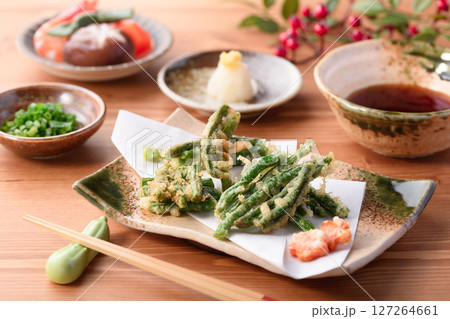 天婦羅の調理シーン さやいんげん