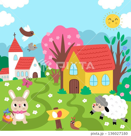 Vector Easter village landscape. Rural nature detailed scene with church, bunny with basket, sheep, egg hunt sign, chick, blooming trees. Cute spring holiday square background or book cover for kids