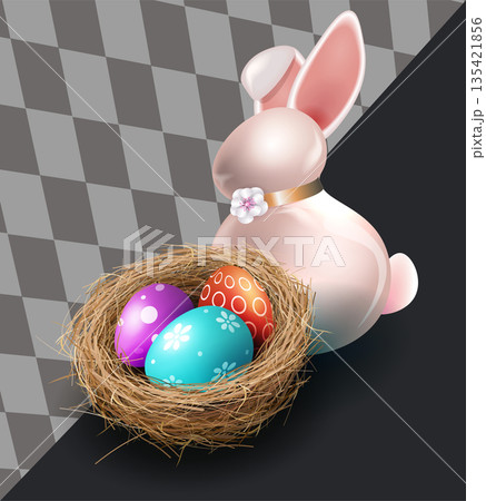 Happy Easter. Festive illustration with Easter eggs, a podium, and a bunny