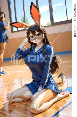 体育館で準備をする若いうさぎ娘