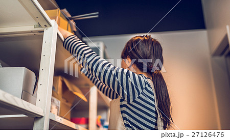 図書館で本を探す若い女性