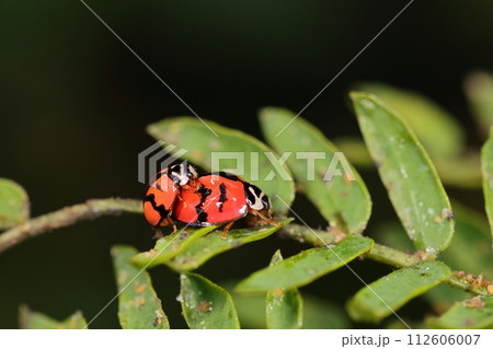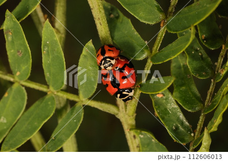 生き物 昆虫 ダンダラテントウ、交尾中の成虫。八重山のダンダラはだんだら模様