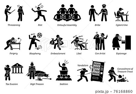 Crime, Criminal, and Law Breakers. Pictogram depicts various criminal activities that includes violent, unlawful assembly, riot, scam, sedition, libel, sedition, and vandalism.