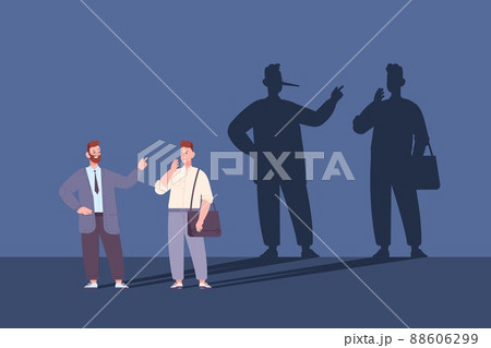 Liar shadow. Dishonest politician or businessman, liars speaker with long nose pinocchio, fraud employee deceive people, lie bad political leader, vector illustration