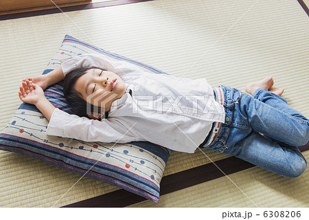 眠るアジア人の小さな女の子。うたたね。