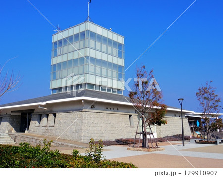 香川県宇多津町 うたづ臨海公園から見た四国水族館の外観とゴールドタワー