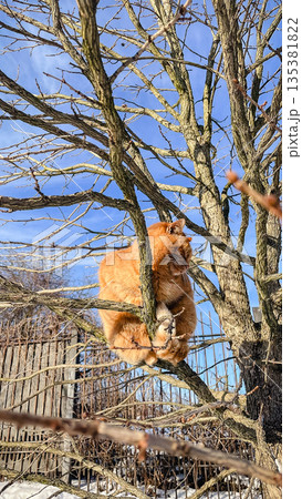 Cute ginger cat sitting on bare tree branches against blue sky and snow in winter garden