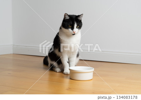 hungry tuxedo cat waiting for pet food looking at bowl