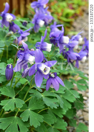 満開の庭のオダマキ