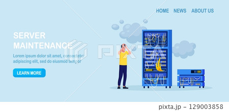 System administrator fixing pc server, network connection. Worried sysadmin looking at burning computer datacenter. System critical failure. High temperature overheat error. Problem solving skills