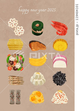 2025年 おせち料理品目の年賀状 水彩風手描きイラスト