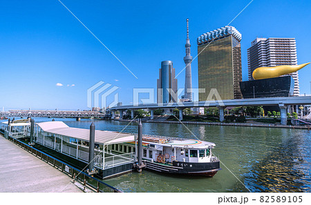 日本の東京都市景観 水上バス・いりすや隅田川、すみだリバーウォーク、特急などを望む