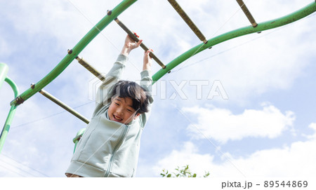 <素材>秋の公園で雲梯にぶら下がる男の子