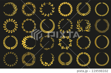 Collection of golden laurel wreaths in different styles on a black background. Ideal for design, decoration, victory themes, academic achievement, and classic embellishment. Vector art, detailed and