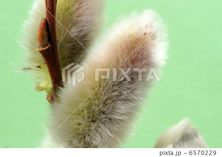 春の素材・春の光を浴びる猫柳の花・横位置アップ