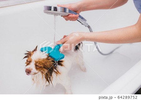 Dog grooming and washing concept. Funny dog with turban made of towel on head in bath