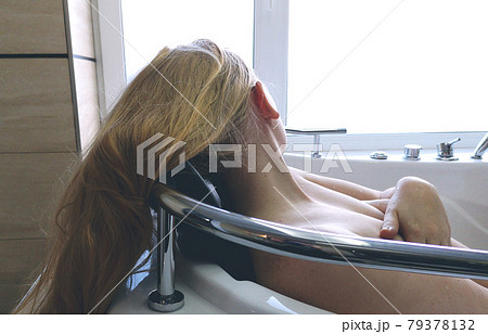 Wellness Concept. Beautiful Young Female Relaxing In Bathtub In Modern Bathroom