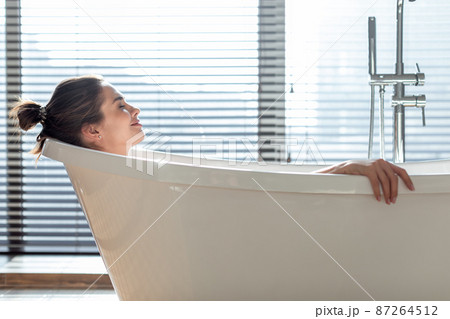 Portrait Of Beautiful Young Lady Posing To Camera While Sitting In Bathtub At Home, Attractive Millennial Woman Relaxing In Luxury Bathroom Interior And Smiling, Closeup Shot With Copy Space