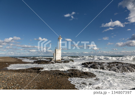 大洗海岸の平太郎浜にある灯柱と波と白雲のある景色