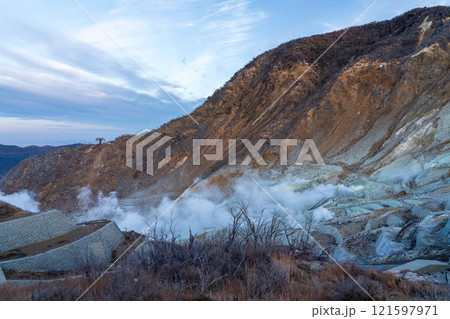 神奈川県箱根町の大涌谷から箱根ロープウェイと北東側方面