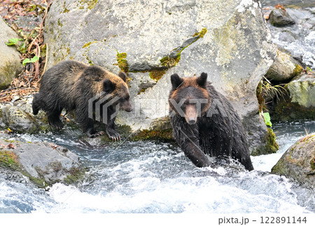 北海道知床半島の渓流で鮭を探すヒグマの親子