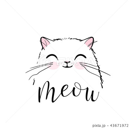 Cute cat vector print design. Meow lettering text. Kitten face vector background. Funny and cool