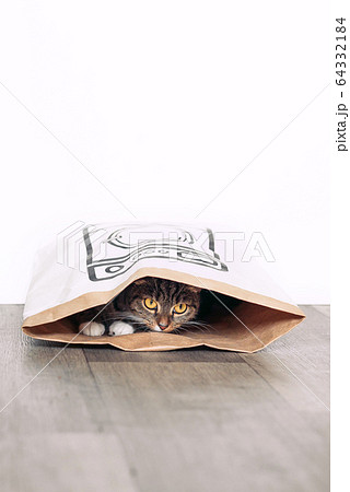 Funny cat looks out of curiosity from a craft paper bag. Funny pets playing at home