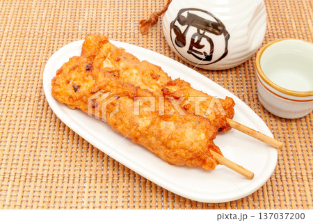 串に刺したサツマ揚げ(イカ、タコ入り)おでん種と日本酒