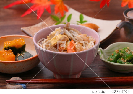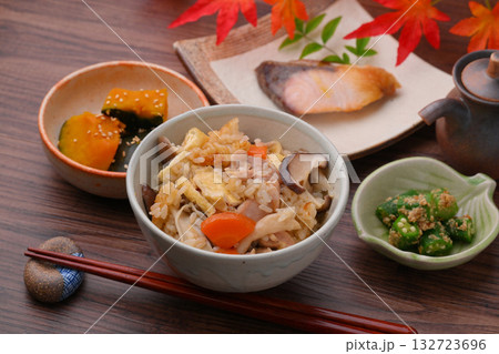 注)紅葉は造花。炊き込みご飯、五目ごはん、きのこご飯。ぶり塩焼き、カボチャ煮物、オクラの胡麻和え。