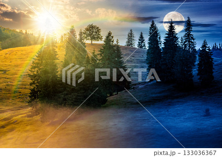 cold morning fog in conifer forest in mountains. day and night time change concept. trees on the hill with sun and moon. wonderful countryside place for photography. duality and transition template