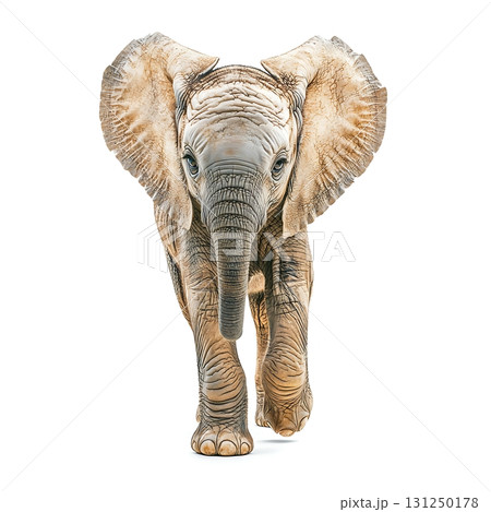 Young Elephant Walking with Expressive Eyes in a Studio Setting on White Background