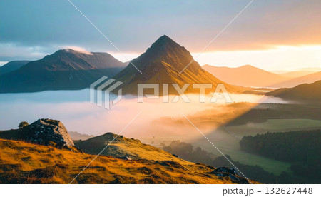 Dramatic Sunrise over Lone Conical Mountain Peak Emerging from Low Fog and Golden Light