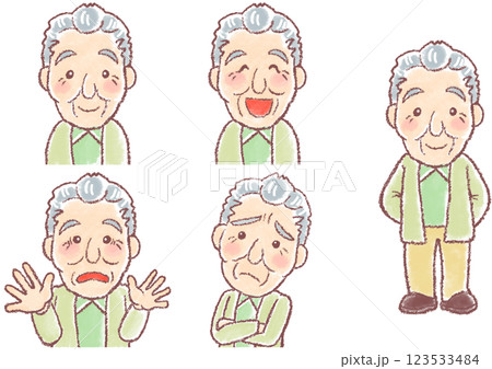 様々な表情のカジュアルな服装の年配の男性 全身 上半身