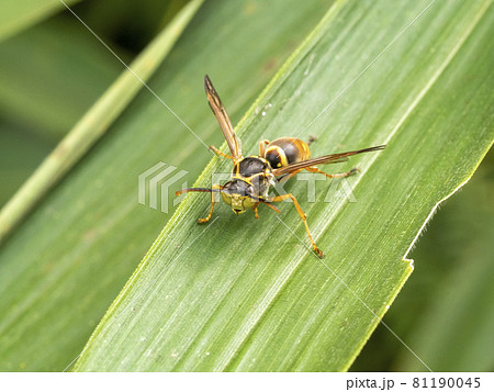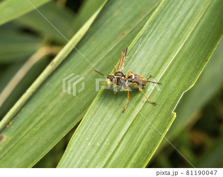 葉の上にいるオスのコアシナガバチ