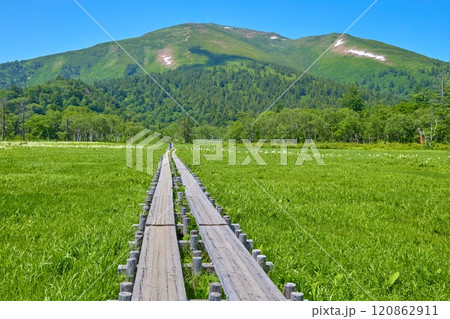 夏の福島県の尾瀬 下田代(沼尻川)付近から燧ヶ岳方面方面の眺望