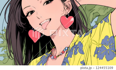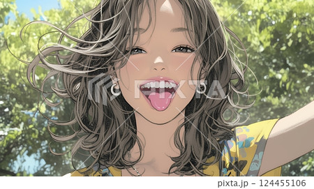 舌を出して陽気におどけている若い女性(シンプルな色使い)