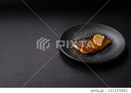 Food, seafood, grilled fish fillet with lemon, salt and spices. Grilled fish fillet