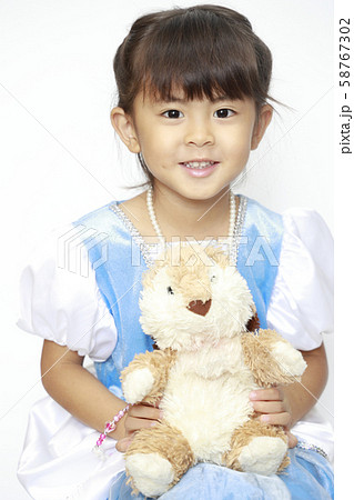 ドレスを着てぬいぐるみを抱える幼児(4歳児)