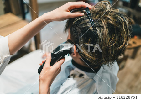 父親に髪を切ってもらう男の子
