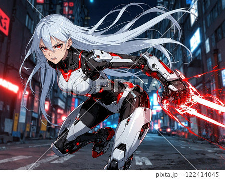 ロボットアームで戦う銀髪の美少女