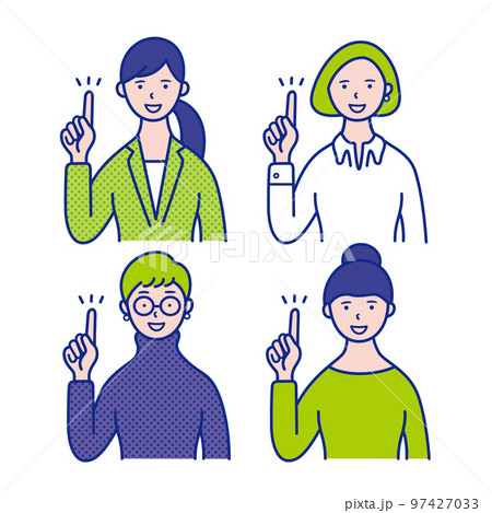 指差しポーズの20代〜40代女性の上半身イラスト素材【セット】