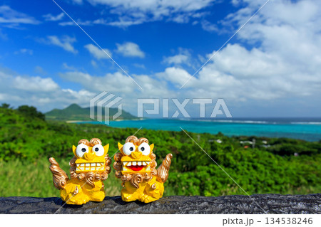沖縄の青い海とシーサー