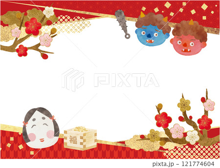 節分 立春 バナー フレーム お多福 鬼 豆まき コピースペース 背景 イラスト素材