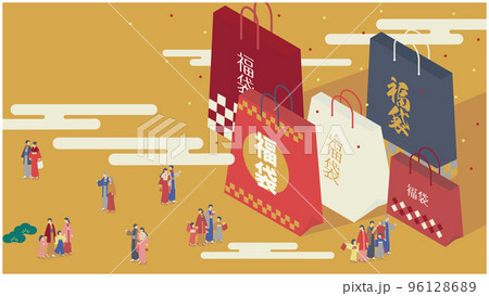 新春の福袋を楽しみに買い物に出かける家族のアイソメイラスト