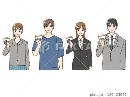 アニメ風の手にカードを持っているカジュアルな服装の若者とビジネスマンのイラストセット