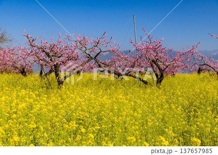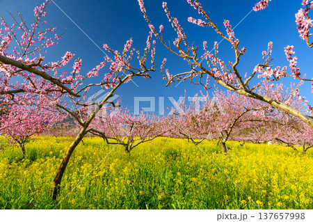 山梨・笛吹桃源郷の一面に咲き誇る満開の桃の花と青空